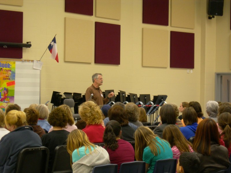 Our student master of ceremonies directs questions to each of the authors. The keynote author speaks. Then we have two breakout sessions where each of the authors will speak in their own locations throughout the school.